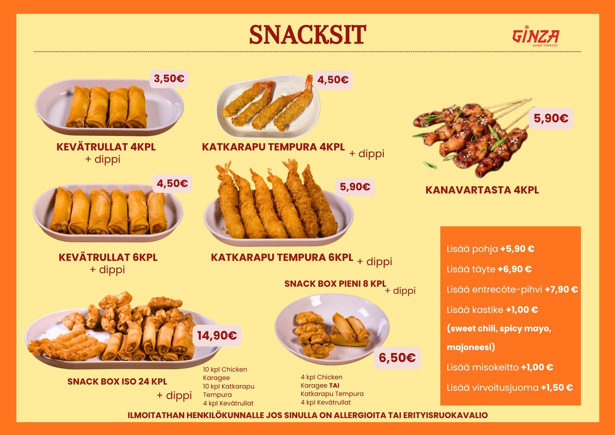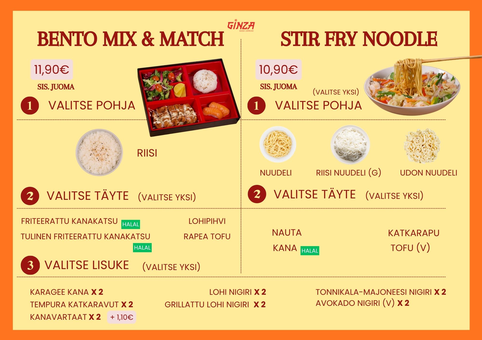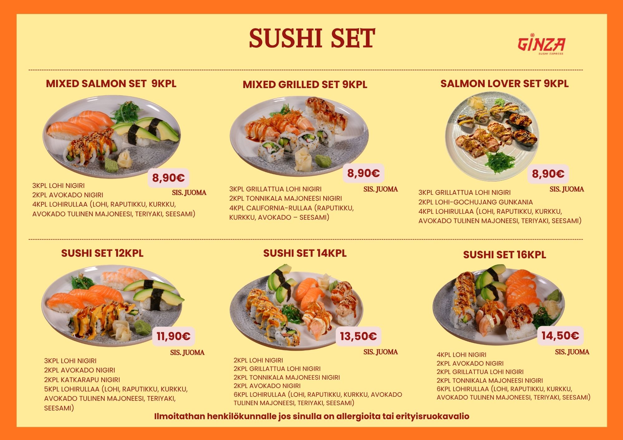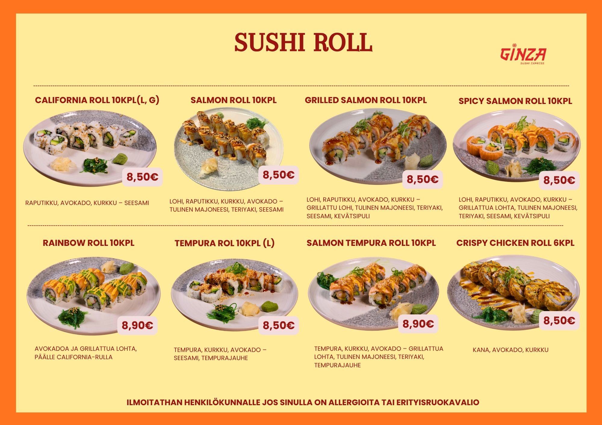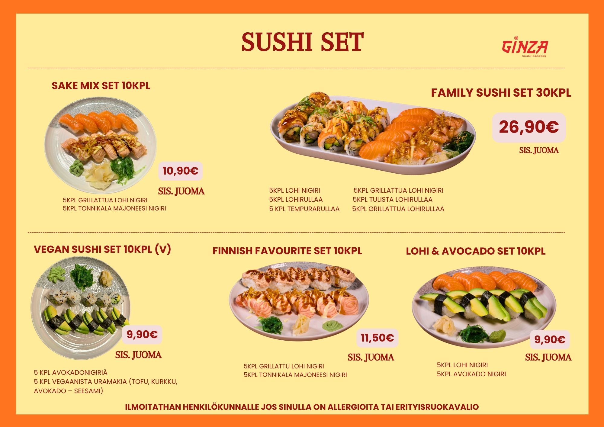 Ginza Sushi Express on Helsingin Itiksen Kauppahallissa toimiva aasialainen pikaruokaravintola, jossa saat tuoretta, käsintehtyä sushia ja lämpimiä annoksia nopeasti ja vaivattomasti. Meiltä löydät edulliset ateriat, joihin sisältyy salaattibuffet ja juomat, sekä suosikkisetit arkeen ja herkkupäiviin – nappaa mukaan, syö paikan päällä tai tilaa kotiin.